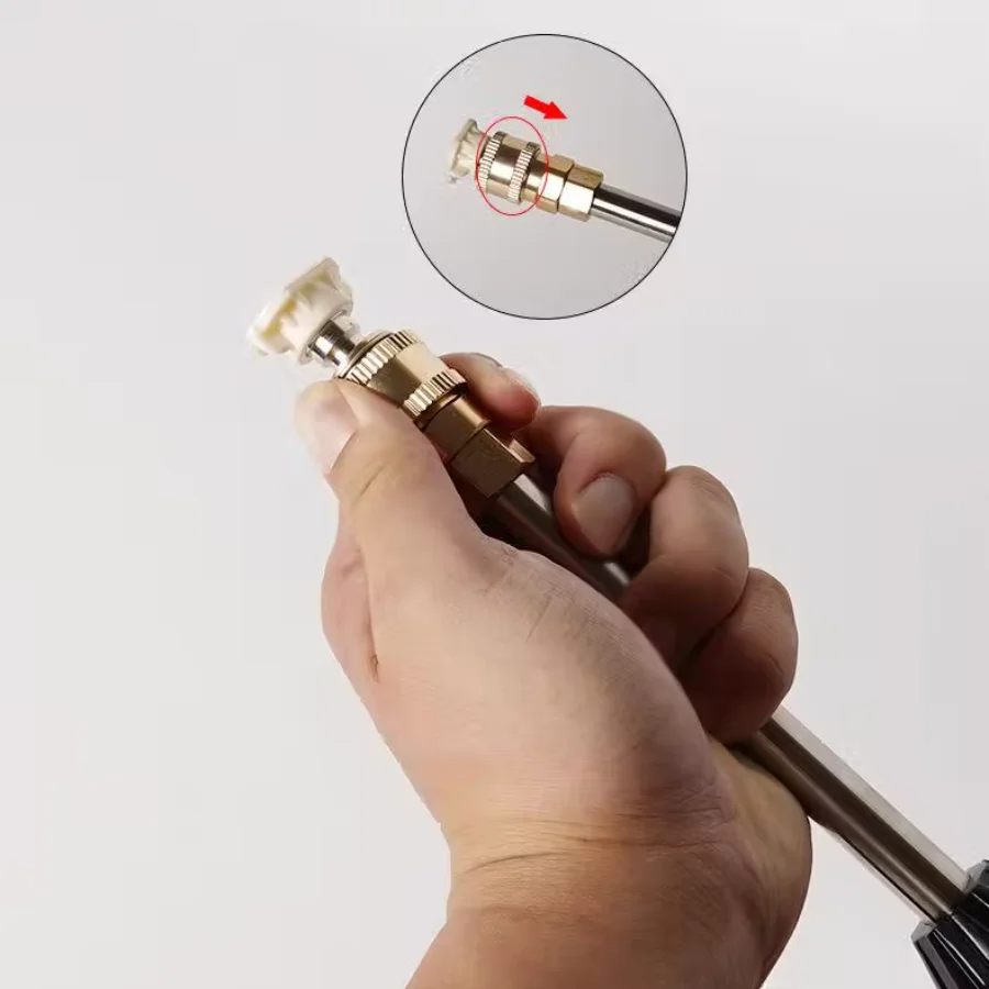 Bocal Turbo Ajustável: Gire para alternar entre o jato Linear (para sujeira pesada e fendas) e o jato Leque (para enxágue rápido e regar plantas delicadas).